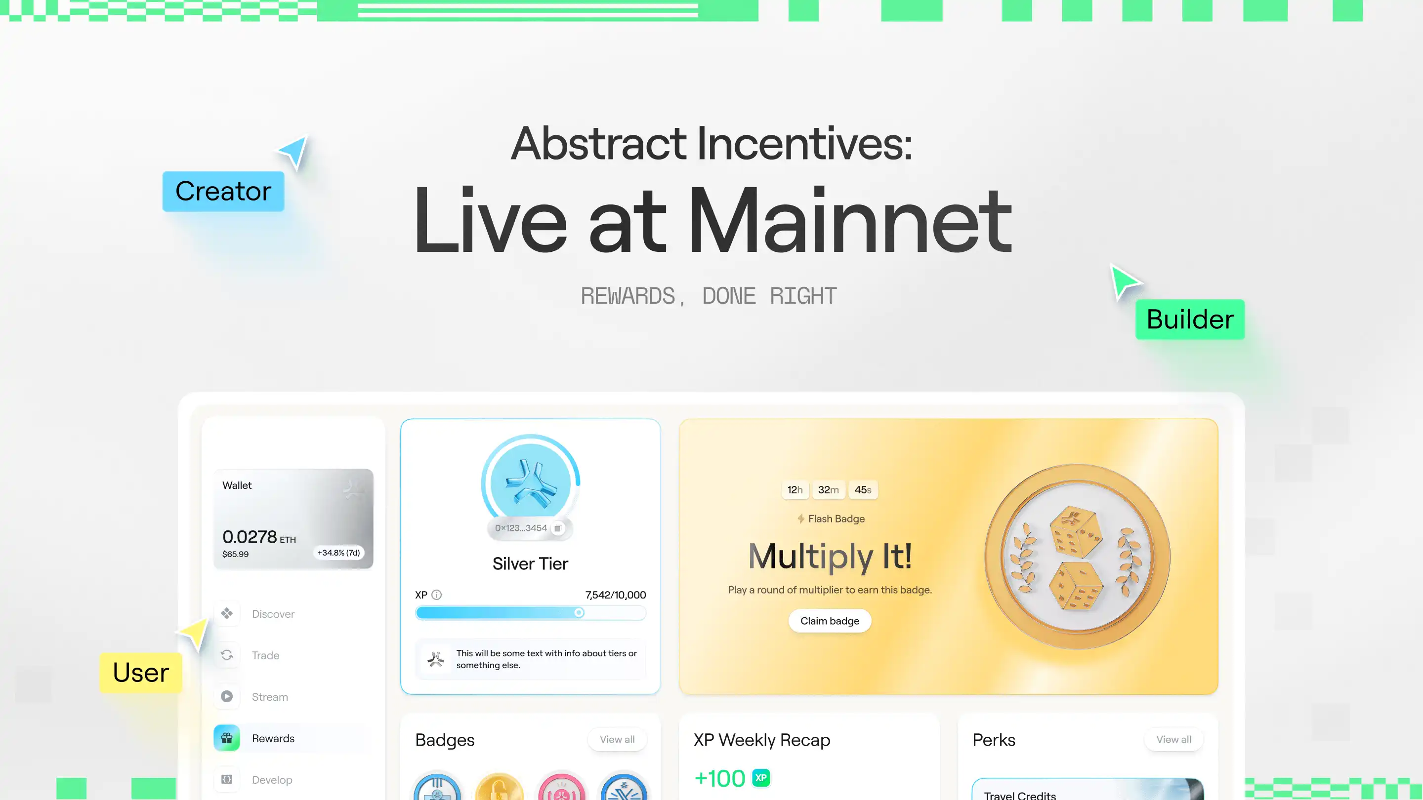 - 开发者:在 Abstract 上构建并部署 App,根据用户使用情况,每月给予对应的 XP 奖励。对于表现突出的开发者,每月还会进行一次评奖活动,额外再给对应的 XP。
