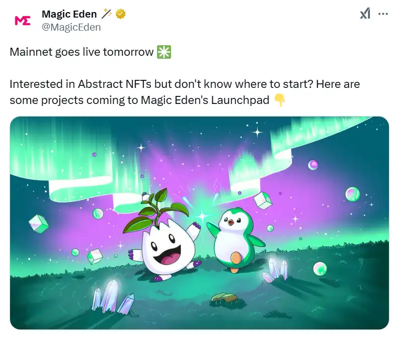 农历新年将至,Abstract 的主网也即将上线。Magic Eden 的官推在今天凌晨发布了一条推文,表示 Abstract 的主网在明天就会上线了: