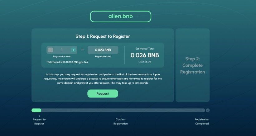 项目方解释.bnb公开注册过程将有两大步骤:请求注册和完成注册,这两个步骤是为了防止其他用户尝试注册同一域名并在用户请求注册后给予保护。