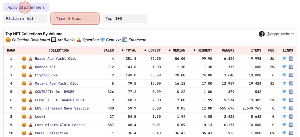 第二,投资者可以时刻观察NFT交易榜单。NFTGod表示他会分析过去4小时热门交易项目中是否出现他从未听说过的项目,如果有的话就快速进行基础研究(创办团队 社群热络度),觉得有潜力的就纳入观察清单。