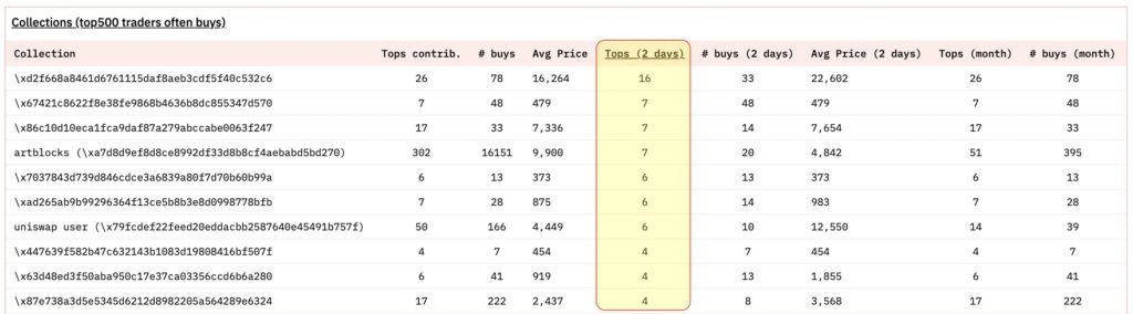 第三,用户可以追踪市场上最成功的NFT交易者动态。在该数据面板中,NFTGod会观察近两天内有最多顶级交易者参与的项目。如果看起来有潜力,他就会把它添加到其观察清单上。