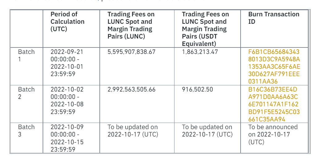 加密货币交易所币安昨(10)晚更新Terra Classic(LUNC)第二轮烧毁资讯,据公告信息显示,10/2日到10/8期间共烧毁29.9亿枚代币,总价值共约91.6万美元,并公布交易ID供用户链上查询。