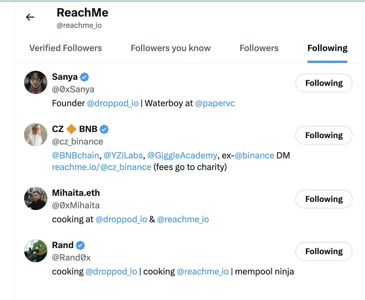 有意思的是,除了 CZ 外 ReachMe 还关注了另外三人:Sanya、Mihaita.eth 和 Rand。三人也身兼另外一个名为 droppod 的项目职位。而 droppod 的创始人 Sanya 也是风投 Paper Ventures 的员工,RootData 数据显示,Paper Ventures 曾投资过 DoubleZero、Pell Network、Renzo Protocol、Sophon、Holonym 等加密项目。