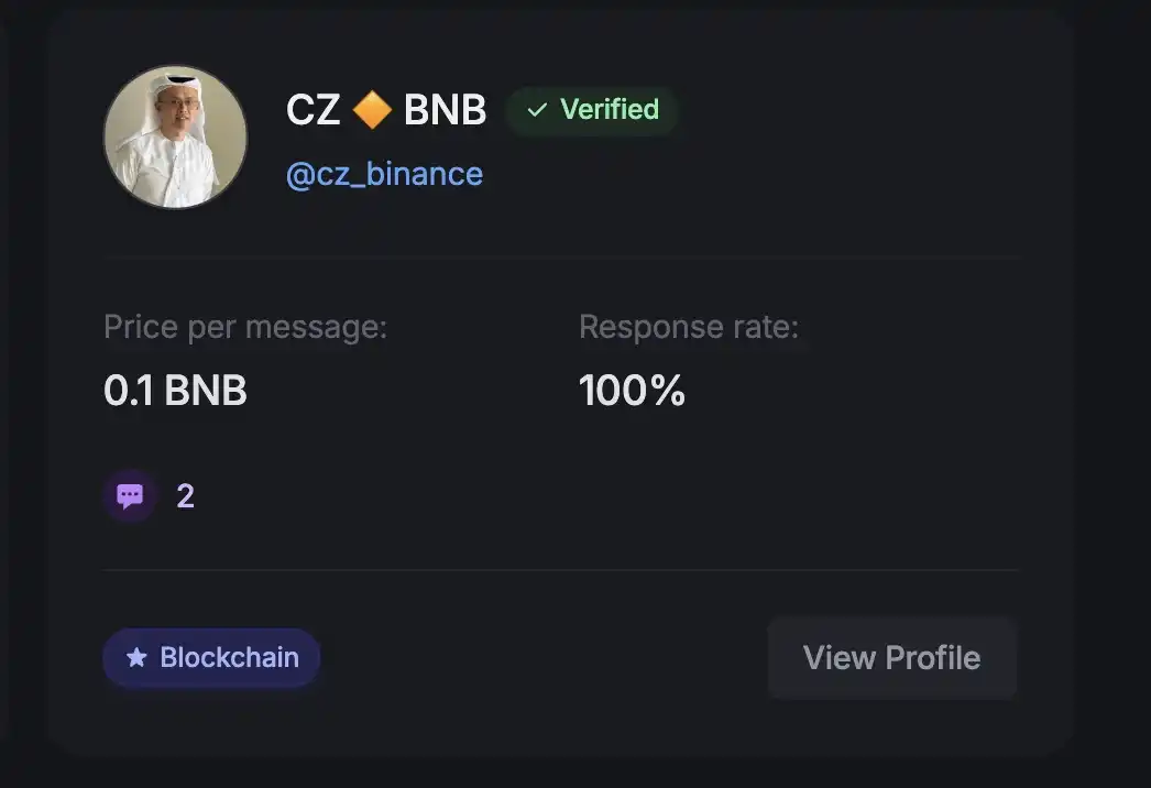 截止发文,ReachMe 已经有很多用户入驻,CZ 的付费聊天价格为 0.1 BNB,已完成两组对话(对外不可见)。