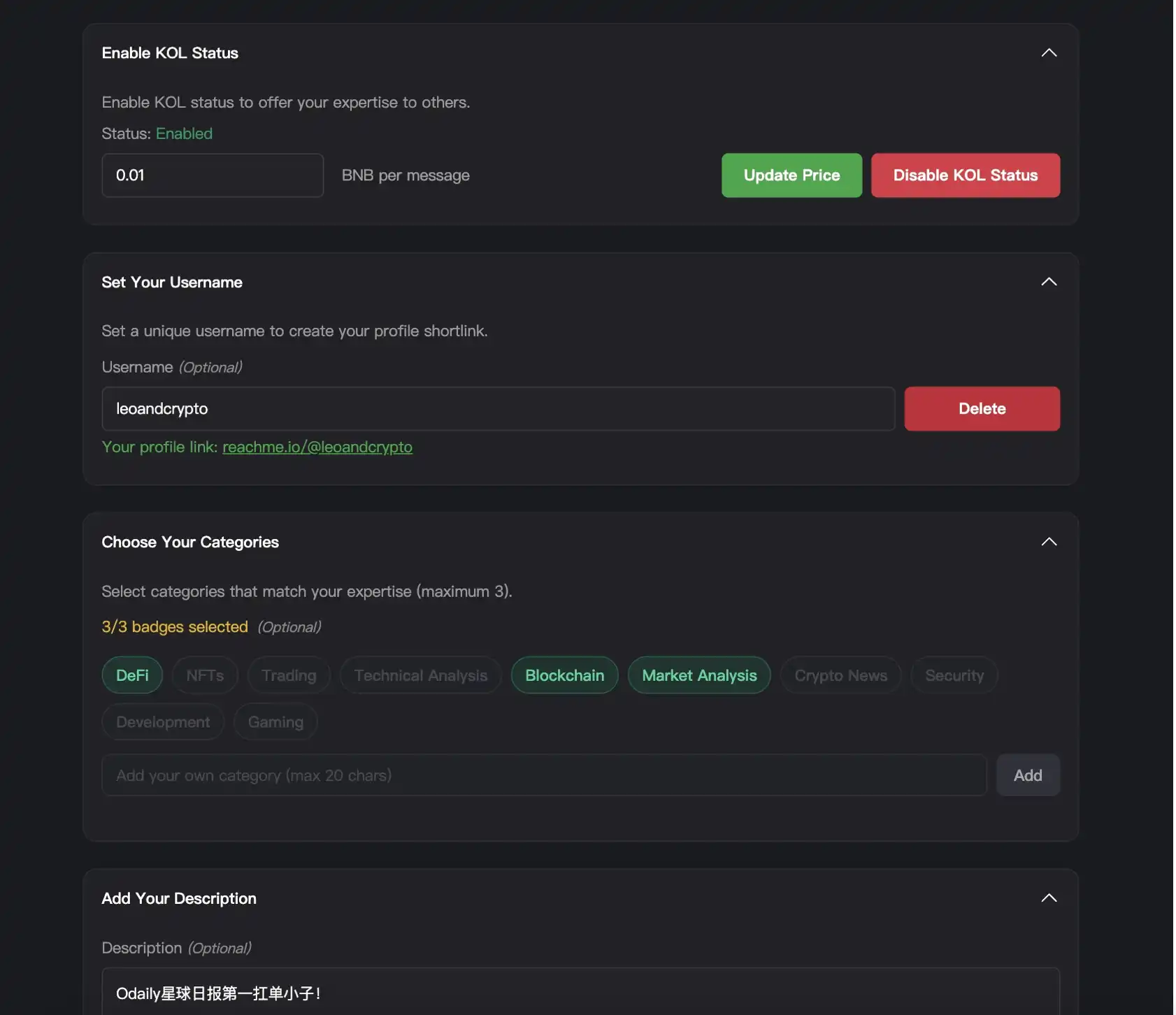 当然,用户也可以连接 X 并完成 KOL 验证的信息,设置(如下图):自己的用户名、发送信息需支付的价格、KOL 分类和本人的描述,等待其他人来撩(打钱)。
