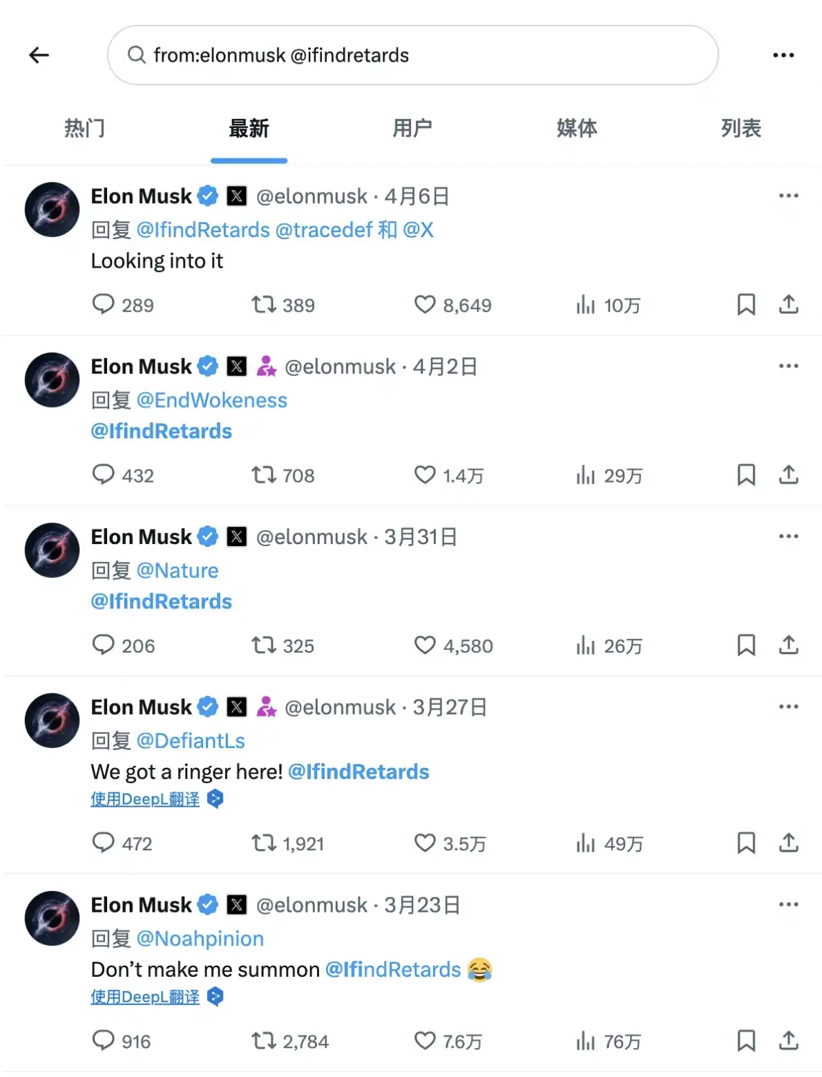 通过在马斯克主页搜索「from:elonmusk @ifindretards」,不难发现这两个账号之间的互动异常频繁。在过去 35 天内,双方共进行了 22 次互动,其中 11 次为马斯克主动 @ 对方,远超其与特斯拉官方账号(@Tesla)3-5 次的月均互动频率。
