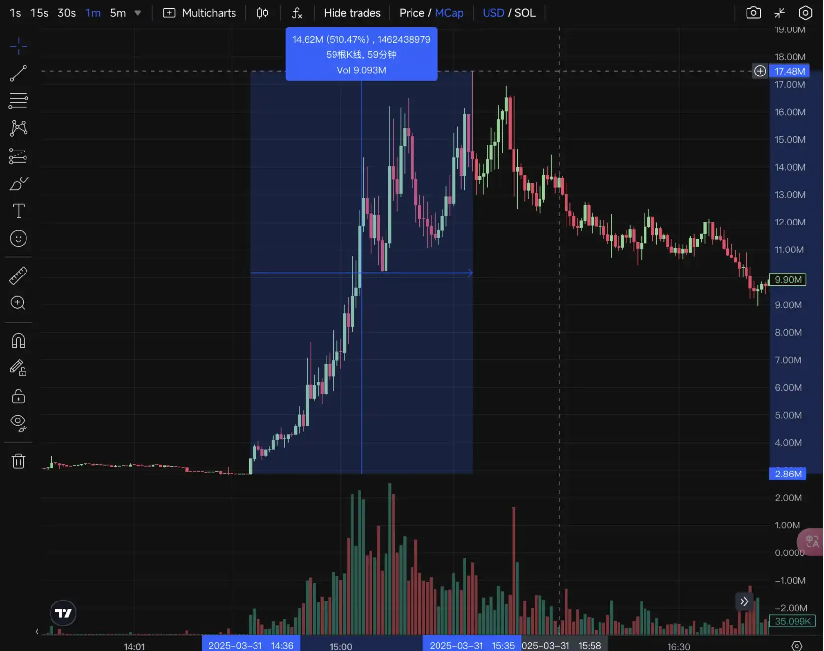 RFC 代币自 3 月 25 日发射后,26 日凌晨市值一度飙升至 900 万美元,随后一路回落至最低 150 万美元,此后市值一直在 200 美元附近盘整震荡。直到 3 月 31 日 14: 36,马斯克在回复 @Nature 帖子时再次 @Retard Finder,RFC 代币市值在一小时内暴涨 510.47%,从 286 万美元跃升至 1748 万美元,创下单次互动带来的最高涨幅记录。