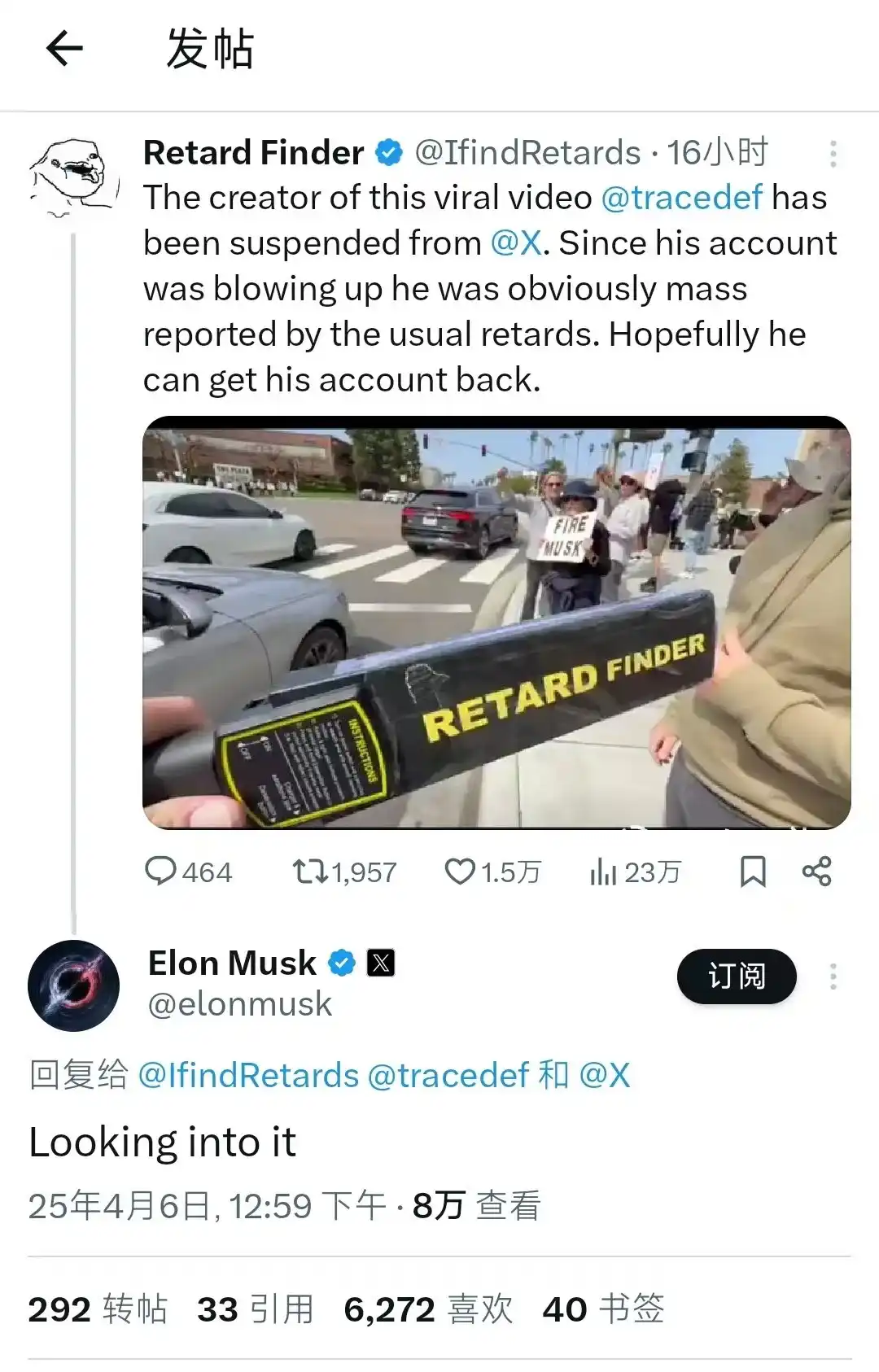 Retard Finder 最初是凭借一则简单而富有讽刺意味的帖子迅速走红:当有人在特斯拉 Cybertruck 上涂鸦纳粹标志时,其仅以一句「Found one」并配上事件截图回应,简练的幽默风格立刻引发广泛传播,也奠定了其「用最少文字揭露荒谬」的风格基调。此后,许多用户自发开始在 X 平台上与 Retard Finder 互动,每当他们发现自己认为的「智障言论」时,都会 @ 该账号; Retard Finder 也会选择性转发这些账号推文,娱乐大众。