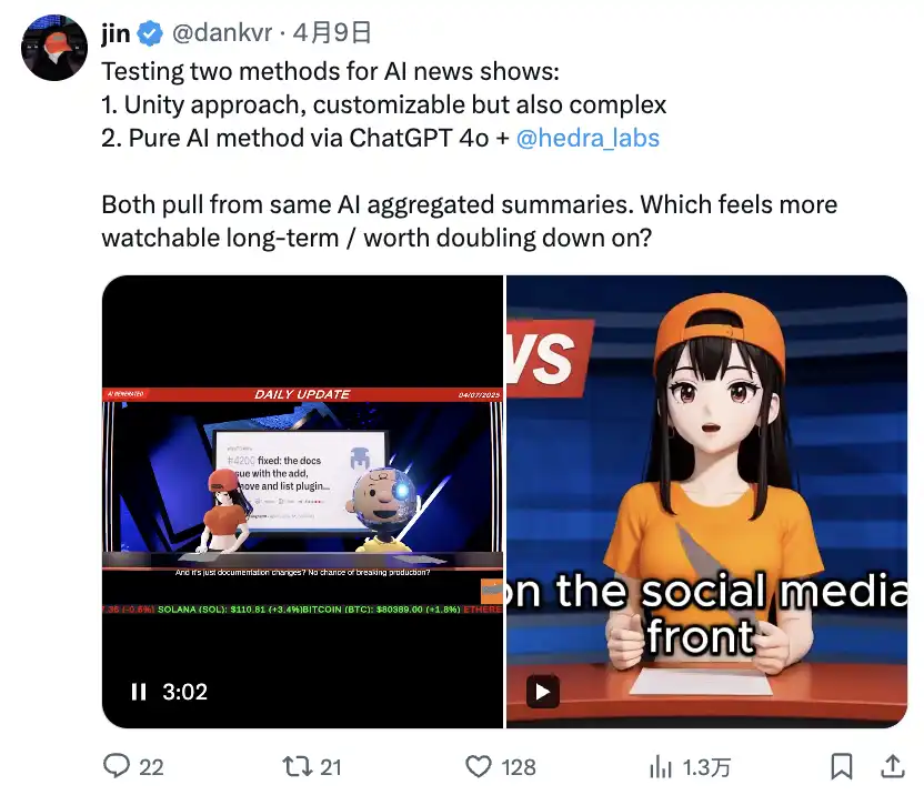测试两种 AI 新闻节目方式: Unity 方法,可定制但也复杂 纯 AI 方法,通过 ChatGPT 4o @hedra_labs两者都来自相同的 AI 聚合摘要。哪种长期更具可看性/值得加倍投入?
