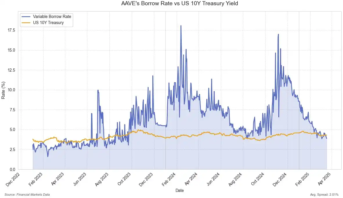 也正因为这种断层,使得加密市场自身的供需动态在利率形成中扮演了更强的角色。当我们取消平滑处理,直接将 AAVE 的利率与全球 10 年期国债利率作图对比时,这种现象更加明显: