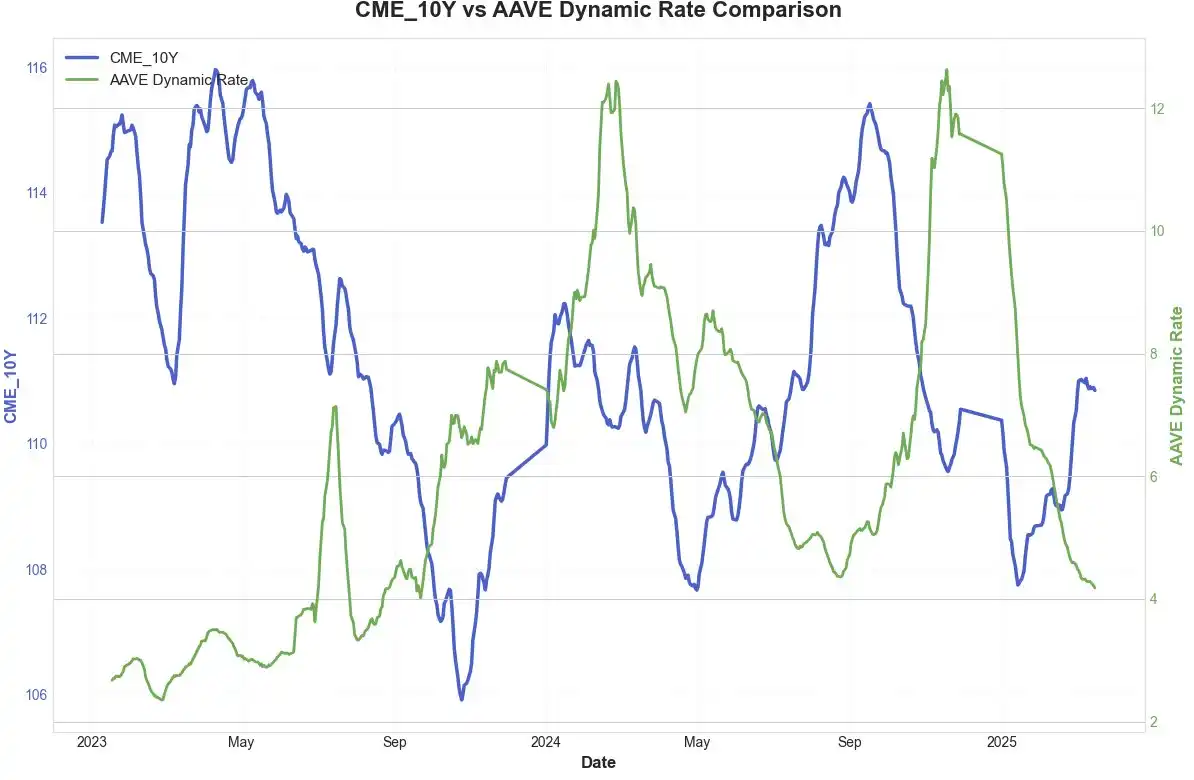 将 AAVE 的平滑化 USDC 浮动利率与 CME 的 10 年期国债期货价格作图对比后,我们就能看出这种宏观经济关联: