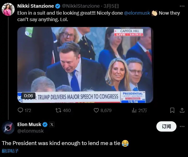 3 月 4 日,在出席特朗普的国会联合演讲时,马斯克所系的领带是跟特朗普借给他的。