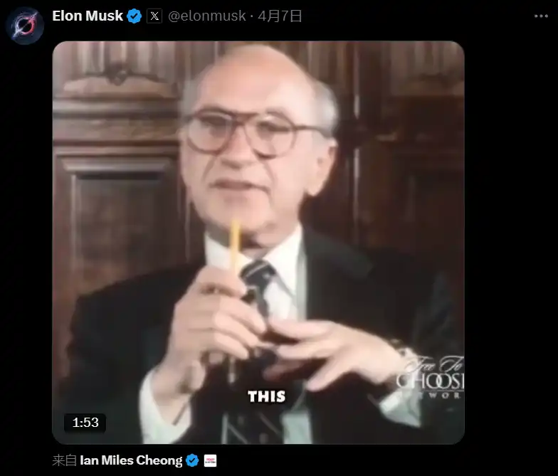 4 月 5 日,在佛罗伦萨举行的意大利联盟代表大会上,马斯克在接受意大利副总理马泰奥·萨尔维尼的视频连线采访时表示:「最终,我希望欧洲和美国能够达成一致,在我看来,理想情况下应该走向零关税,从而有效地在欧洲和北美之间建立一个自由贸易区。」4 月 7 日,马斯克在 Twitter 上分享了一段视频,视频中已故自由市场经济学家米尔顿·弗里德曼讨论了自由贸易的好处。马斯克没有附加任何文字,但这一举动被广泛解读为对特朗普关税政策的批评。