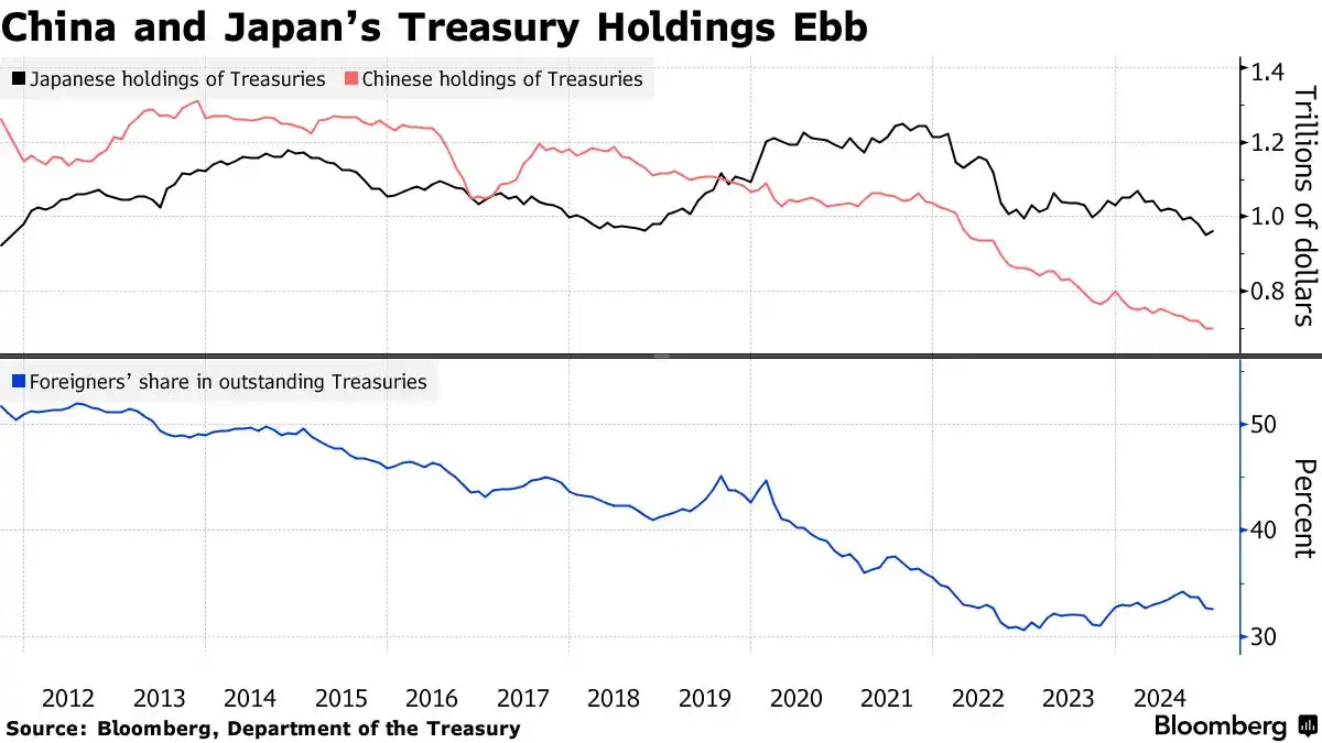 虽然很难实时证明,但美国国债价格下跌时,人们通常猜测是外国在抛售。这一次,有人认为这是对特朗普关税政策的回应。中国和日本是美国国债的最大持有国。官方数据显示,两国一段时间以来一直在减持。
