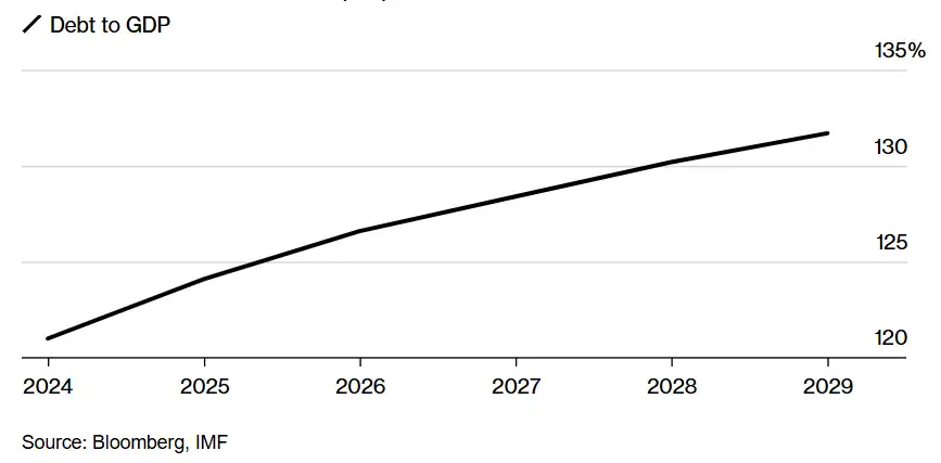 国际货币基金组织预测,到 2029 年,美国债务占国内生产总值的比例将达 131.7%。