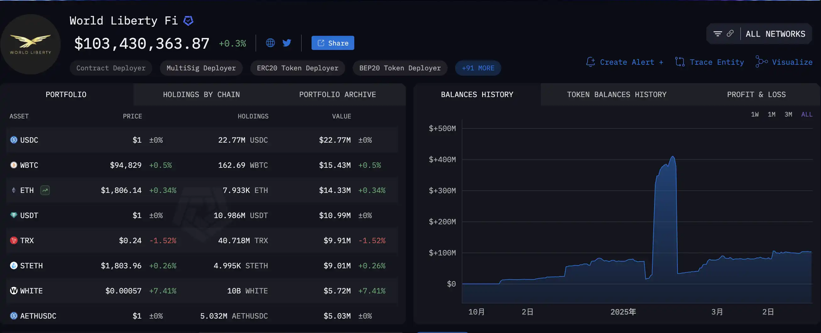 初期销售仅仅达 1200 万美元,直到特朗普当选总统,市场一阵 FOMO 之后大量买入迅速全数售出,而波场创始人孙宇晨则更甚,投资 3000 万美元成为其最大外部投资者。随后 WLFI 便宣布将对多个代币进行投资,时至今日,其地址上的资金已经从 4 亿美元缩水至 1 亿美元。