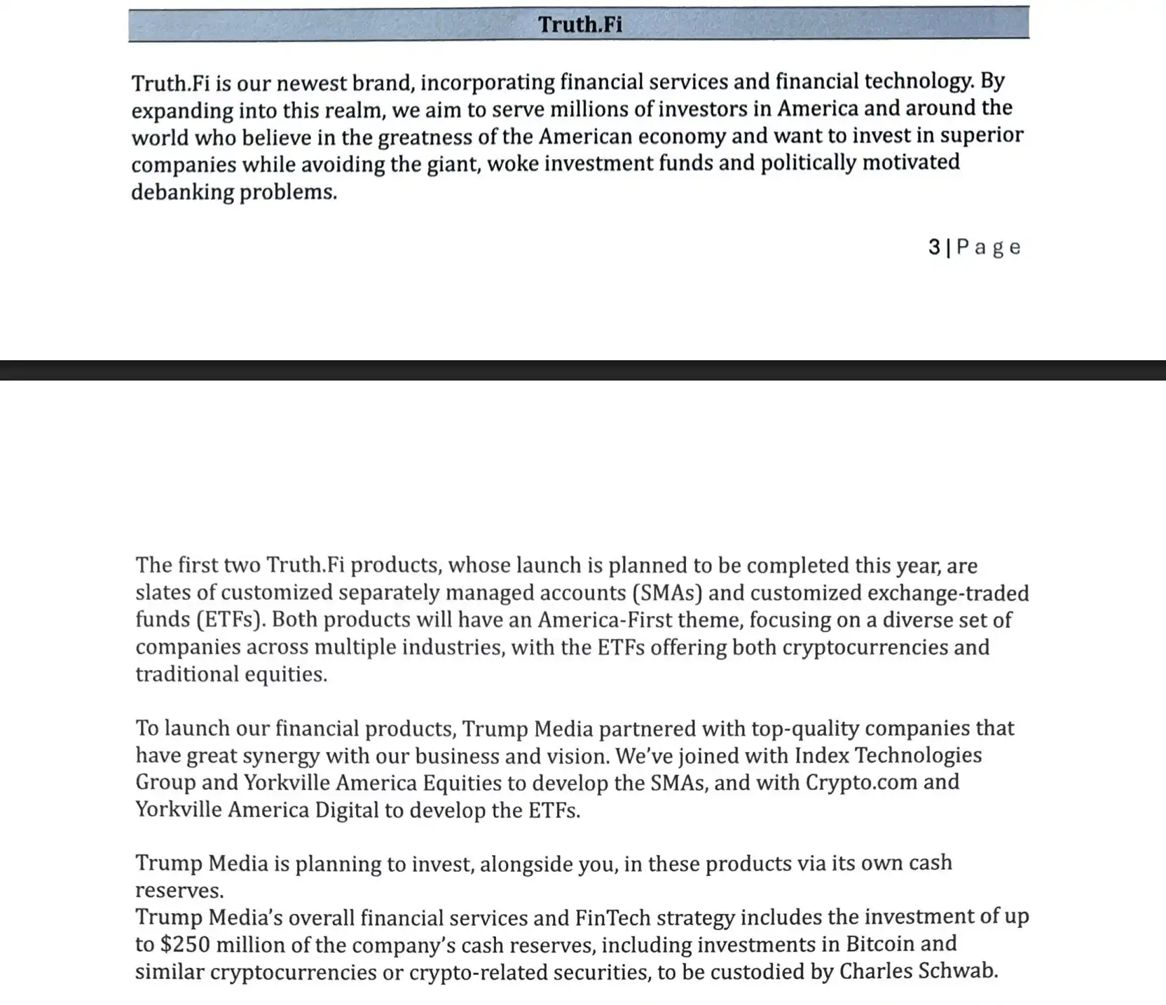 Truth.Fi 计划在今年推出的首批两款产品,其一是与 Index Technologies Group 和 Yorkville America Equities 合作开发的定制化单独管理账户「SMAs」,以及与 Crypto.com 和 Yorkville America Digital 合作的定制化交易所交易基金「ETFs」。其中的 ETFs 业务将同时涵盖加密货币和传统股票领域。