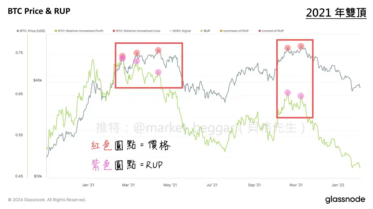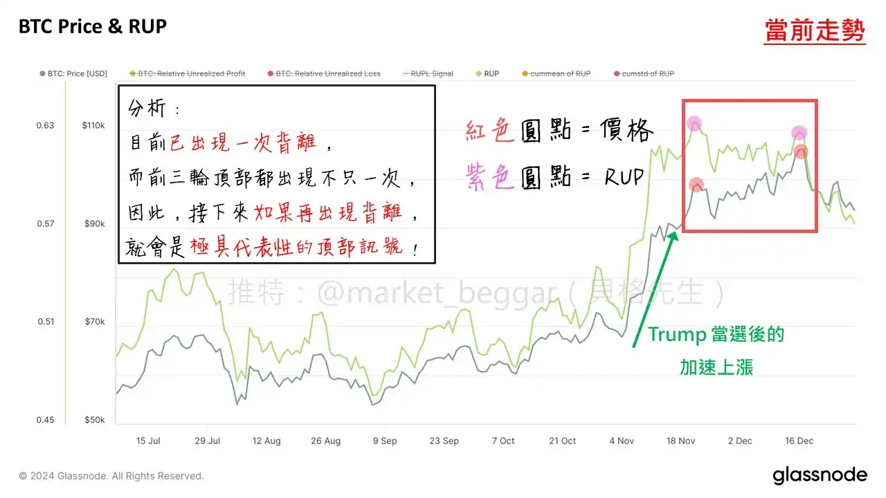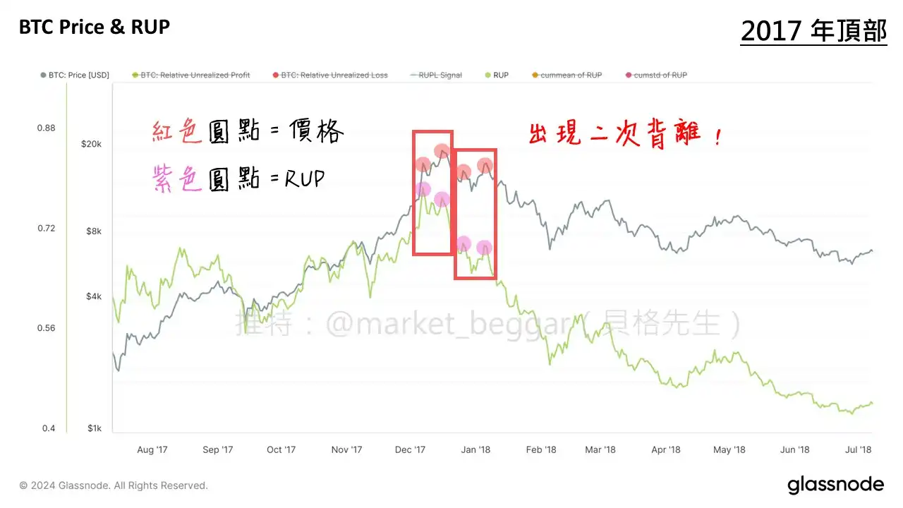 当 RUP 与 $BTC 价格走势出现背离时,很可能意味着顶部出现