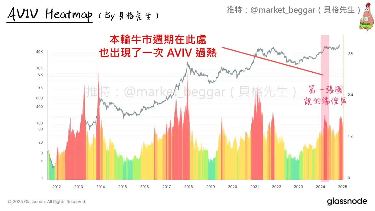 如图所示,我一样将「端倪区」,也就是今年的三、四月左右标记出来。可以看到当时在 AVIV Heatmap 上出现了一段时间的「过热」,随后经过半年左右的宽幅震荡,化解了过热状态;而后当价格突破 10 万大关时,AVIV 再次显示过热。