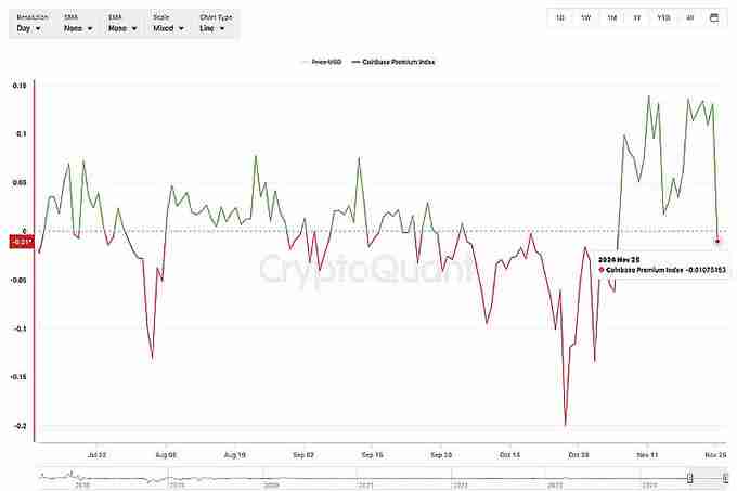 Coinbase 溢价指标显示,比特币在Coinbase 的价格相对于币安已经出现负溢价,代表美国市场的买盘兴趣正在下降,可能预示着市场情绪的转变。
