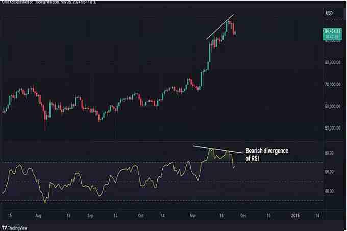 Godbole 指出,虽然比特币在上周涨到99,000 美元上方,但相对强弱指数(RSI)并未同步上涨,出现背离现象。