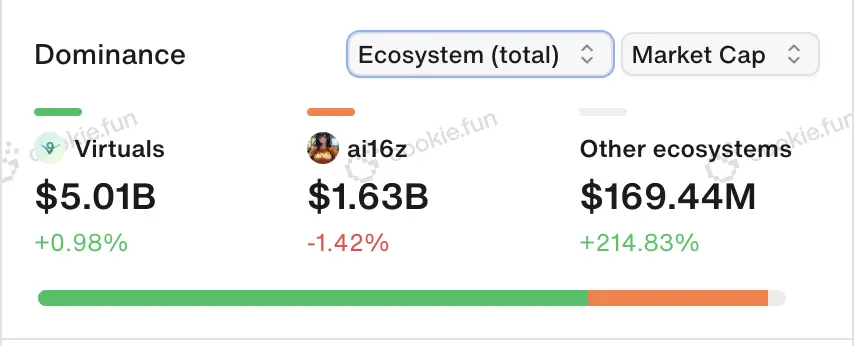 ai16z与Virtuals主导AI Agent市场,贡献超过半数份额