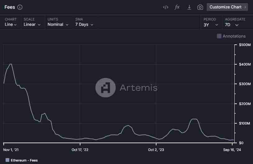但随着用于执行的 L2,甚至像 Celestia 这样的替代数据可用性(DA)层的推出和发展,以太坊的费用已经下降。通过放弃核心创收服务,以太坊的费用和收入都有所下降。这对 ETH 的价格产生了很大的影响。
