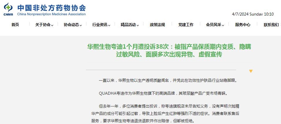 今年3月,中国非处方药物协会的官方网站公开了一则信息,名为《华熙生物夸迪1个月遭投诉38次:被指产品保质期内变质、隐瞒过敏风险、面膜多次出现异物、虚假宣传》。