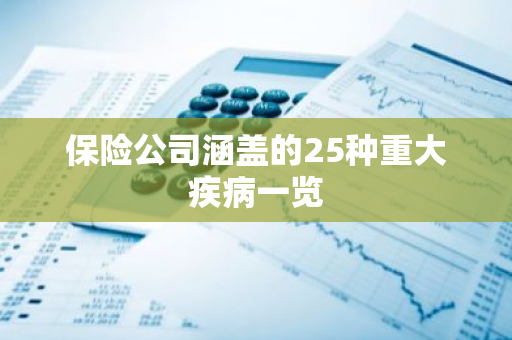 1. 恶性肿瘤 2. 急性心肌梗塞 3. 脑中风后遗症 4. 重大器官移植术或造血干细胞移植术 5. 冠状动脉搭桥术(或称冠状动脉旁路移植术) 6. 终末期肾病(或称慢性肾功能衰竭尿毒症期) 7. 多个肢体缺失 8. 急性或亚急性重症肝炎 9. 良性脑肿瘤 10. 慢性肝功能衰竭失代偿期 11. 脑炎后遗症或脑膜炎后遗症 12. 深度昏迷 13. 双耳失聪 14. 瘫痪 15. 心脏瓣膜手术 16. 严重阿尔茨海默病 17. 严重脑损伤 18. 严重帕金森病 19. 严重Ⅲ度烧伤 20. 严重原发性肺动脉高压 21. 严重运动神经元病 22. 语言能力丧失 23. 重型再生障碍性贫血 24. 主动脉手术 25. 严重的多发性硬化