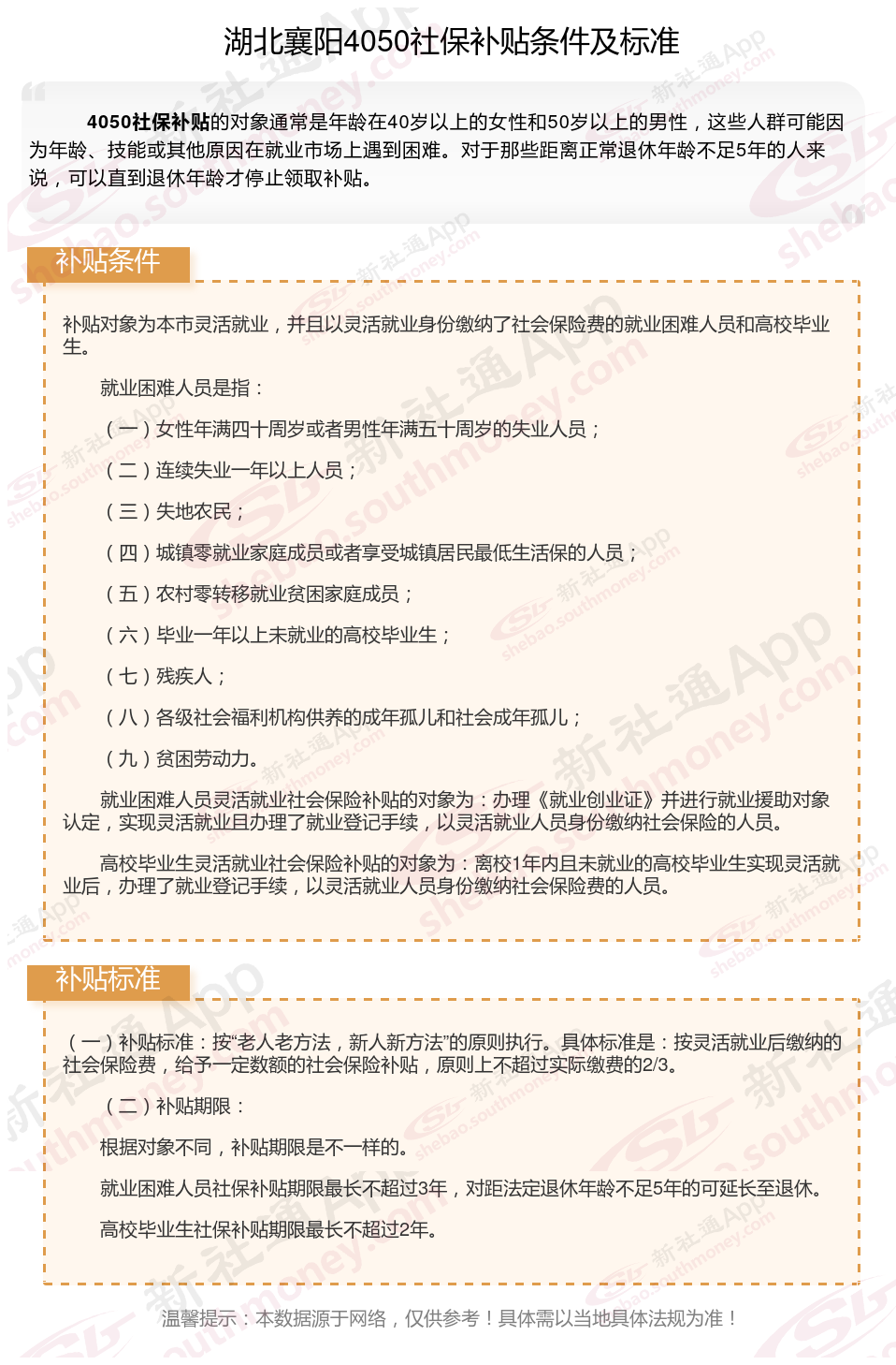 一、2023-2024年湖北襄阳4050社保补贴标准及条件,最新如下