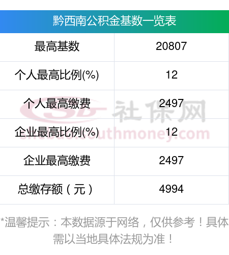 最新公积金最高缴存上限是多少?2024-2025年的黔西南公积金最高缴纳标准查询表