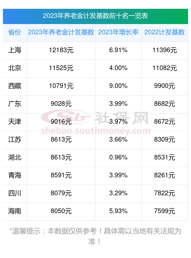首先来看看,2023年全国养老金计发基数的前十省份一览表
