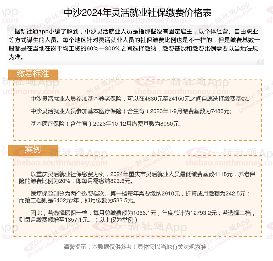 一、2024年中沙灵活就业社保缴费基数、比例最新消息