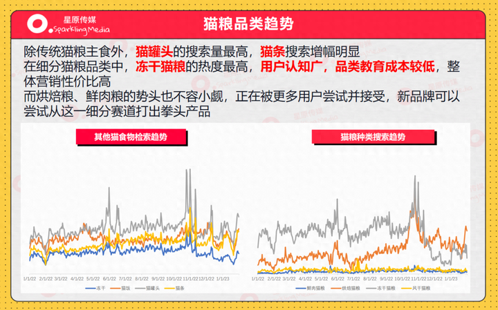 所以他们对猫粮怎么挑、怎么选之类的干货及横测非常关注,这也是猫粮赛道搜索热度较高的内容主题之一!