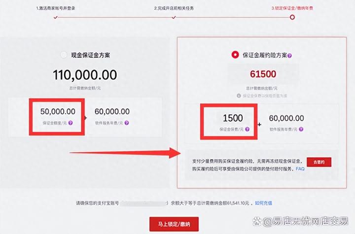 (保费额度=店铺应缴纳现金保证金额度*3%,也就是说原来是5万保证金的店铺,现在只需要缴纳一年1500元的保险费,无需缴纳保证金。)