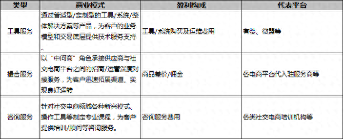 该模式下,平台依托基于大数据、新技术的专业服务为社交电商各个环节赋能,按照提供的服务类型可分为以下3类: