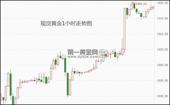 现货黄金周三反弹,金价回到1920美元附近。周四开盘后,金价延续涨势,不过从1小时走势图来看,红色动能柱缩短,多头动能减弱,金价涨势放缓。现货黄金仍然缺乏强有力的催化剂。