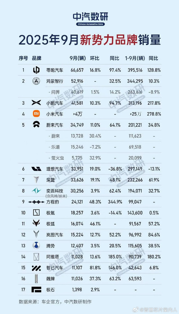 9月新势力品牌销量出炉:鸿蒙执行第二 小米排第四