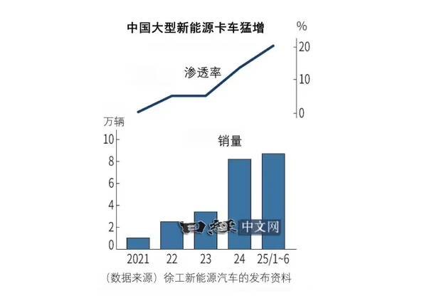 2025年,中国新能源商用车发展势头迅猛,大型纯电动卡车市场呈现爆发式增长。据日媒报道,2025年1至6月,中国大型新能源卡车销量已达8.71万辆,超过2024年全年总量。目前,新能源车型在商用车市场中的占比已提升至20%。