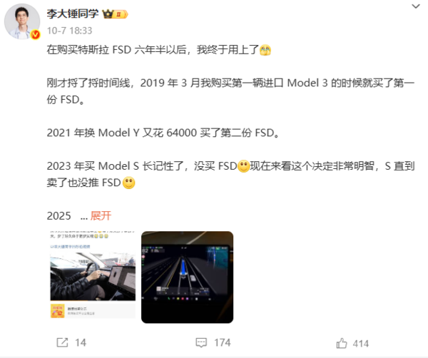 苦等六年半!博主买三份特斯拉FSD终于用上“大期货”