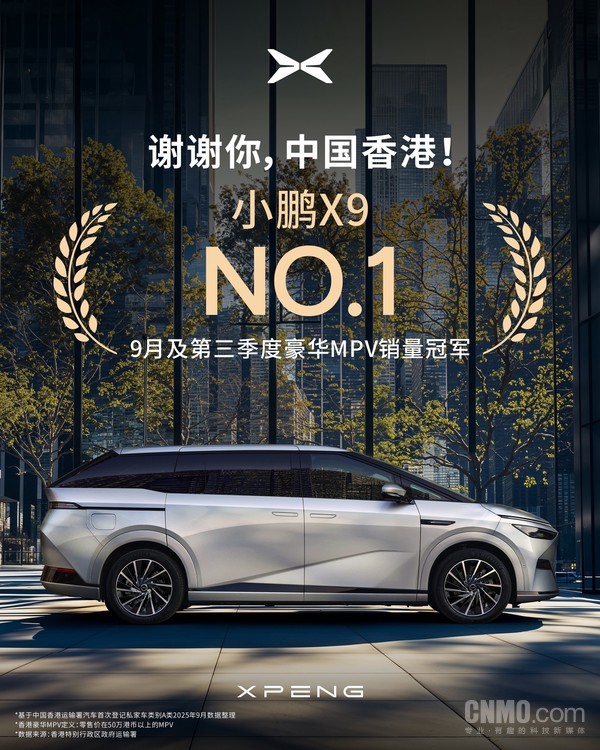 小鹏X9获中国香港9月及第三季度豪华MPV销量冠军