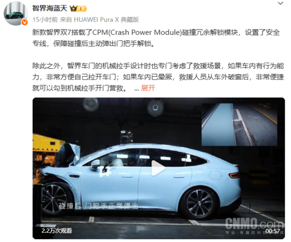 近日,智界产品总监海蓝天发文称,新款智界R7/S7搭载的CPM(Crash Power Module)碰撞冗余解锁模块,设置了安全专线。了解到,这一设计能够在车辆发生碰撞后,主动弹出门把手进行解锁,为车内人员逃生和外部救援提供关键支持。