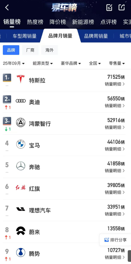9月中国豪华汽车品牌新车销量:特斯拉奥迪鸿蒙居前三