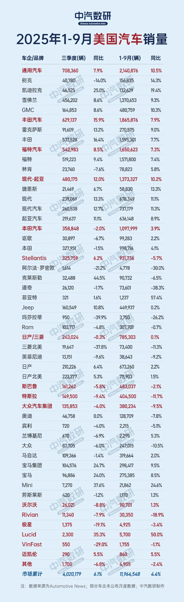 2025年美国三季度及前三季度汽车销量分析 丰田排第二