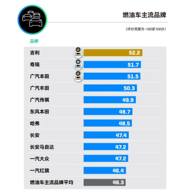 相比之下,燃油车阵营口碑优势明显:燃油车豪华品牌平均NPS高达51.8分,其中路虎(67.3)、保时捷(59.4)表现突出;燃油车主流品牌平均也达到46.3分,吉利(52.2)、奇瑞(51.7)等中国品牌位居前列。