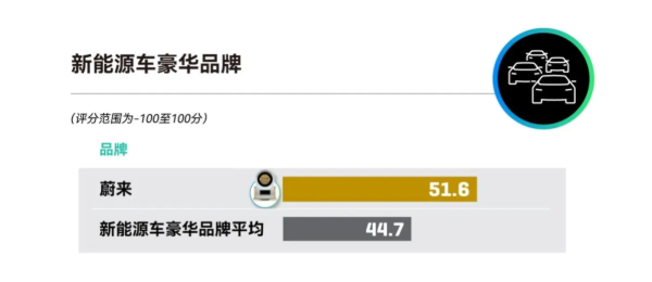 值得注意的是,在新能源豪华品牌中,蔚来以51.6分位居第一,成为少数能与燃油豪华品牌口碑抗衡的新能源品牌,但其所在细分市场平均分(44.7)仍显著低于燃油豪华品牌(51.8)。