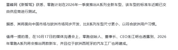 在10月17日举行的媒体沟通会上,零跑创始人、董事长兼CEO朱江明透露,2026年零跑A系列将推出两款全新车型,同时位于西班牙的零跑海外工厂也将于当年建成投产。这一布局标志着零跑全球化战略进入新阶段。