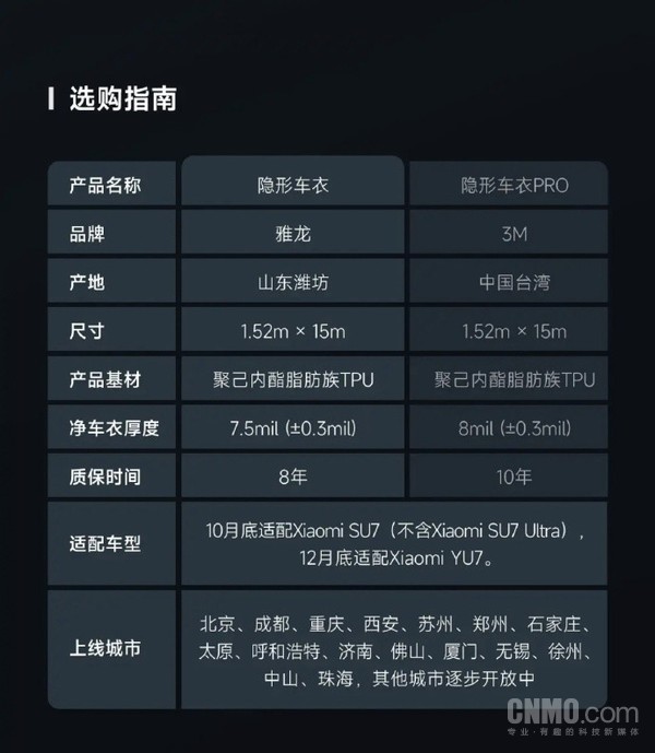 根据官方公布的适配计划,隐形车衣将于10月底适配小米SU7(不含SU7 Ultra),12月底适配小米YU7。首批上线城市包括北京、成都、重庆、西安、苏州、郑州、石家庄、太原、呼和浩特、济南、佛山、厦门、无锡、徐州、中山、珠海等,其他城市将逐步开放。