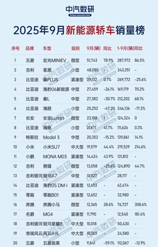 注意到,根据中汽数研发布的排行榜,9月共有19款新能源轿车月销量突破万辆,9款车型销量超2万辆,市场竞争格局持续深化。