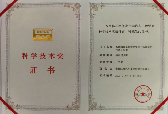 近日,在第32届中国汽车工程学会年会暨展览会(SAECCE 2025)开幕之际,2025年度“中国汽车工程学会科学技术奖”举行颁奖典礼。江汽集团凭借参与的“智能网联车辆数据安全与高效防护技术及应用”项目荣获科技进步奖一等奖,另一项目“高效环保轻型柴油机关键技术研究及产业化”获得三等奖,充分展现了其在汽车核心技术领域的创新实力。